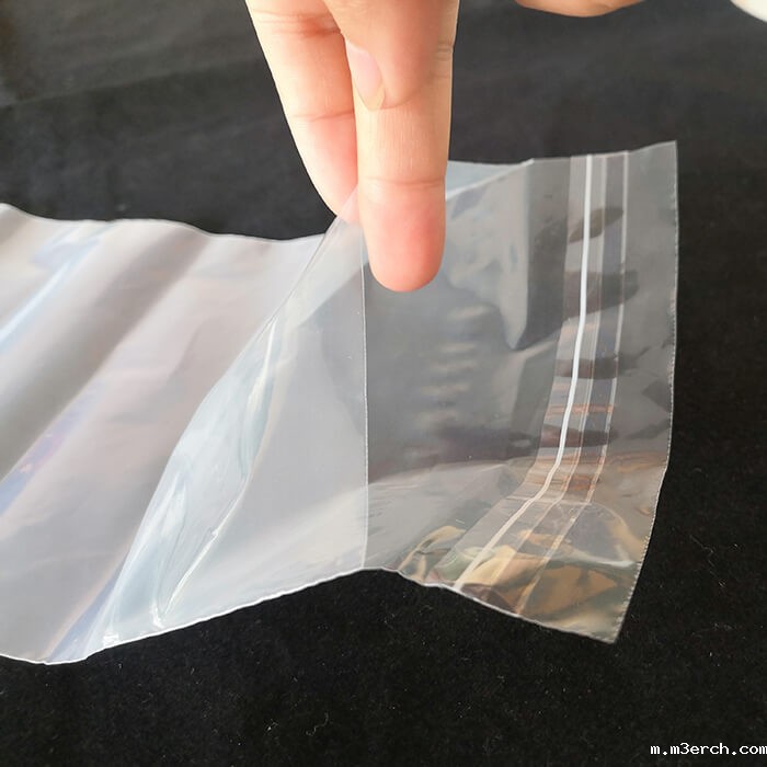透明自粘袋   自粘袋是一种为普通PE胶袋为原型,加以改良的胶袋,改良的地方主要是在PE平口袋的基础上加上一个可折回的盖子。为了方便盖子的使用,在盖子上加了一条自粘胶条,因此它有了另一个新的名字------自粘袋。